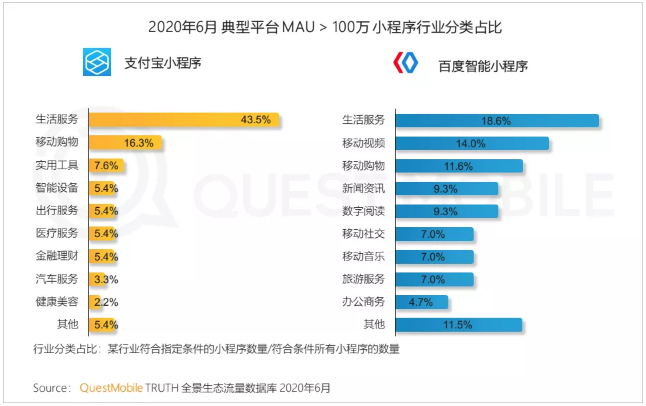 這種同質化,也導致三家平臺在生活服務、移動購物、移動視頻三個核心領域進行用戶爭搶:雖然微信小程序總用戶量呈現一家獨大的局面,不過在生活服務領域,支付寶、百度均有上佳表現;而移動購物上,支付寶小程序表現很好;百度則在移動視頻上保持高速增長。