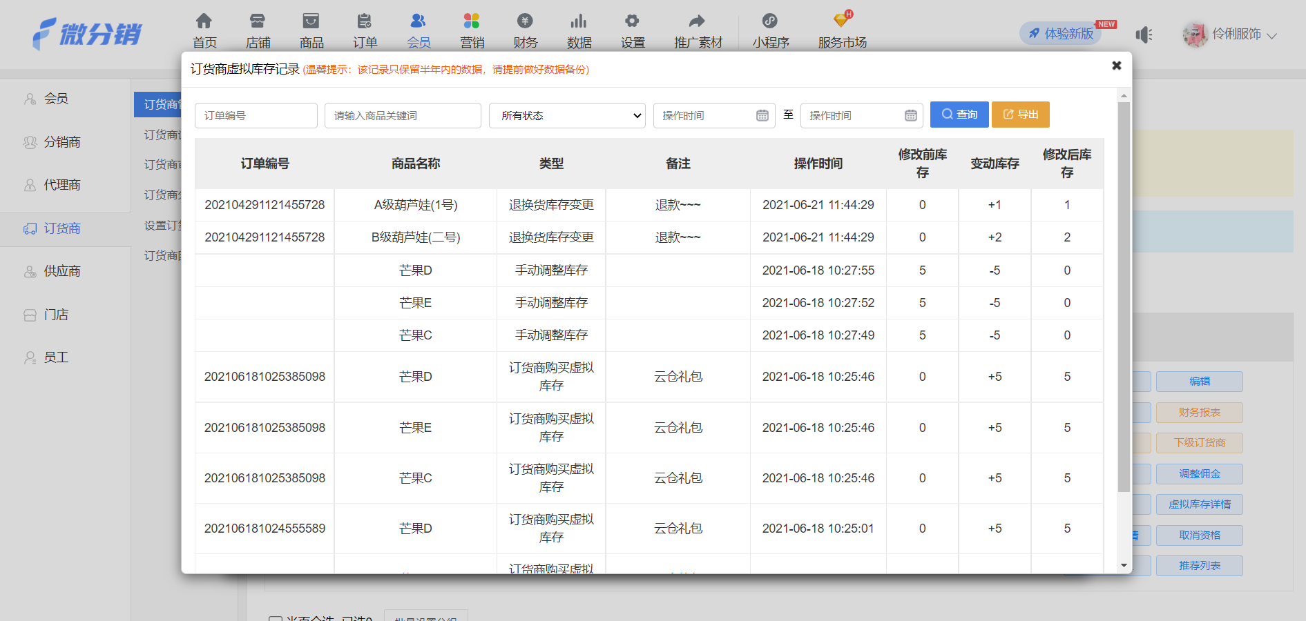 現(xiàn)邏輯:訂貨商虛擬庫存記錄中增加提醒:虛擬庫存記錄半年清除;