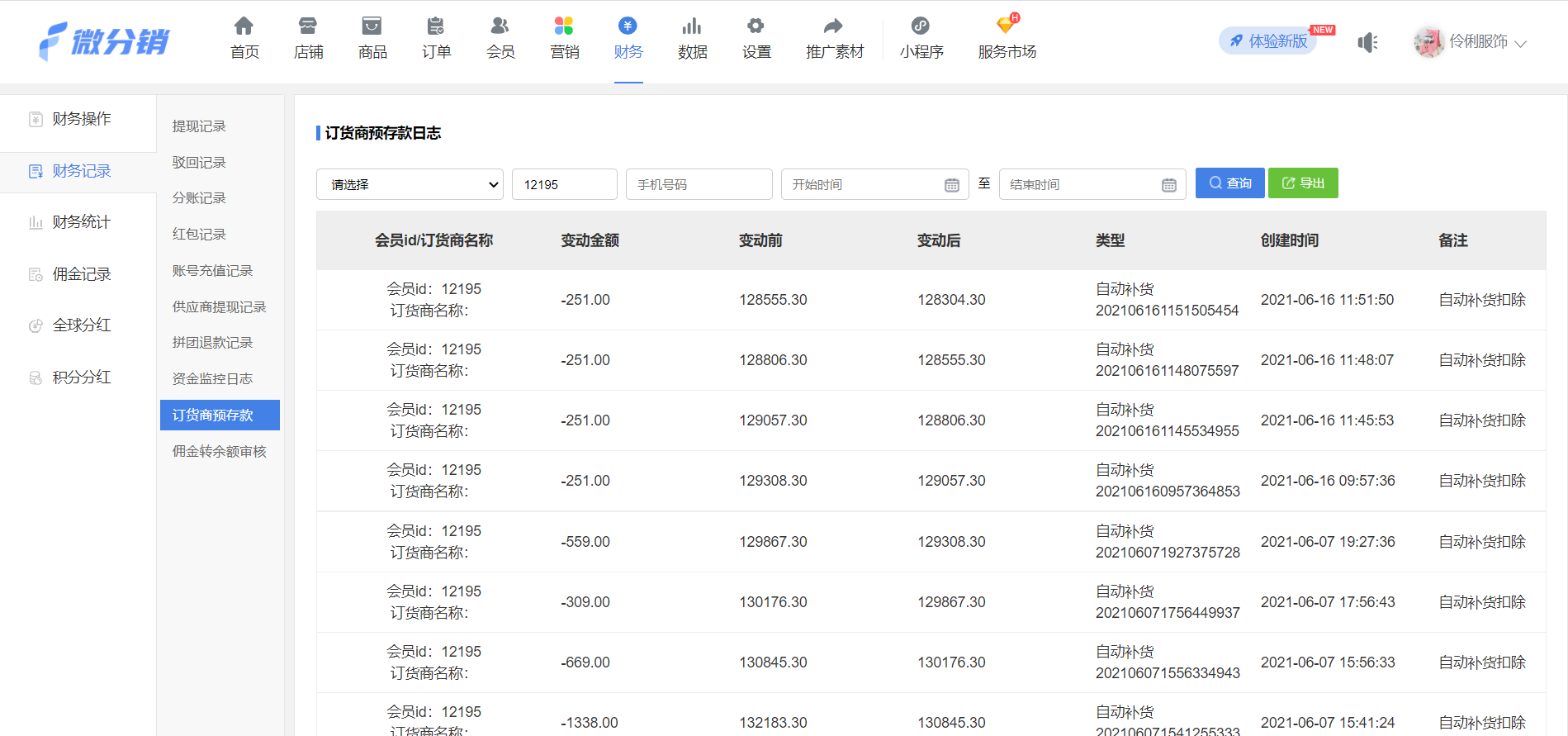現(xiàn)邏輯:財務(wù)-財務(wù)記錄-訂貨商預(yù)存款,導(dǎo)出表格增加“變動前”和“變動后”的字段和對應(yīng)的數(shù)據(jù);
