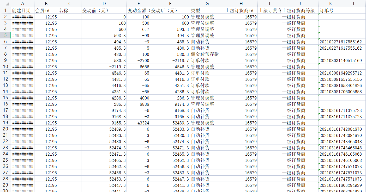 04、訂貨商預(yù)存款導(dǎo)出的表格增加“ 變動前”和“變動后”對應(yīng)的數(shù)據(jù)