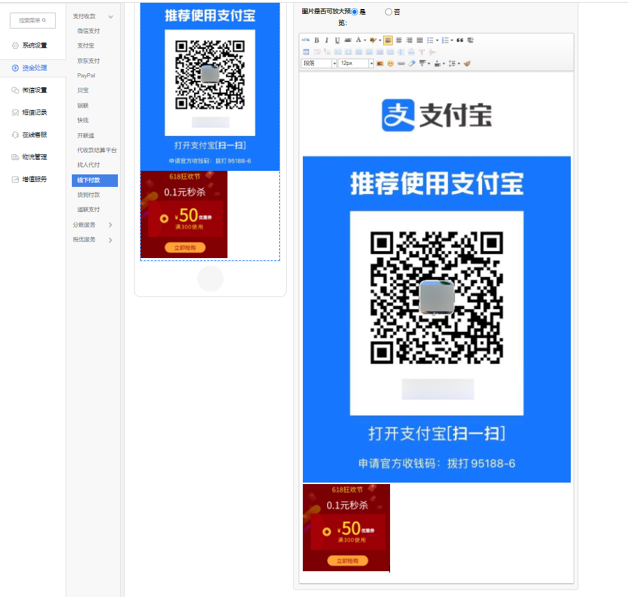 現(xiàn)邏輯:設(shè)置-資金處理-線下付款,上傳圖片后,手機端下單選擇線下付款時,能夠根據(jù)手機自適應(yīng);