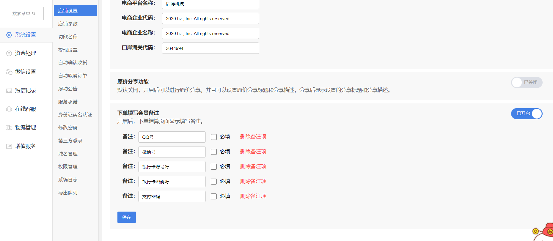 現(xiàn)邏輯:系統(tǒng)設(shè)置-店鋪信息-購物設(shè)置-下單填寫會員備注資料;買家下單時,提示需要填寫信息才可下單;