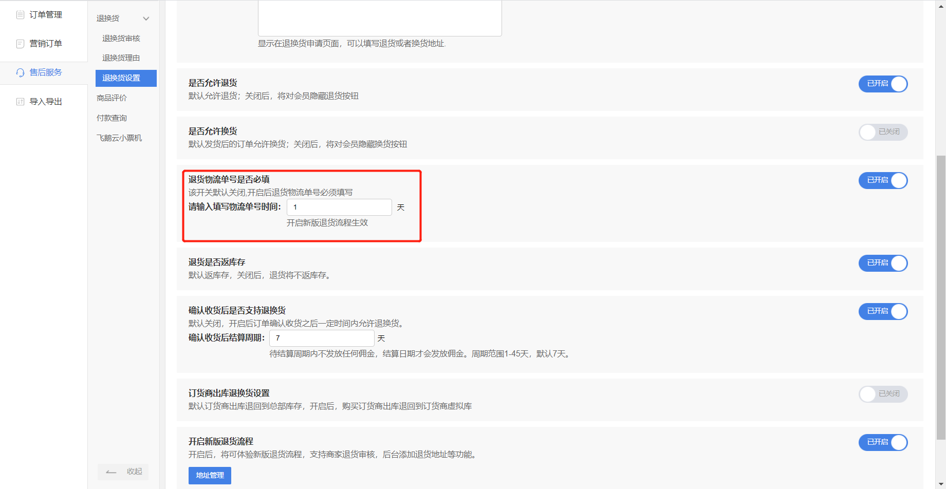 現(xiàn)邏輯:通過管理后臺-售后服務(wù)-退換貨設(shè)置-請輸入填寫物流單號時間設(shè)置填寫退貨單號的時間,請輸入1~60之間的整數(shù)。買家超期未填寫系統(tǒng)會自動拒絕退貨申請。此功能需要開啟新版退貨流程生效。