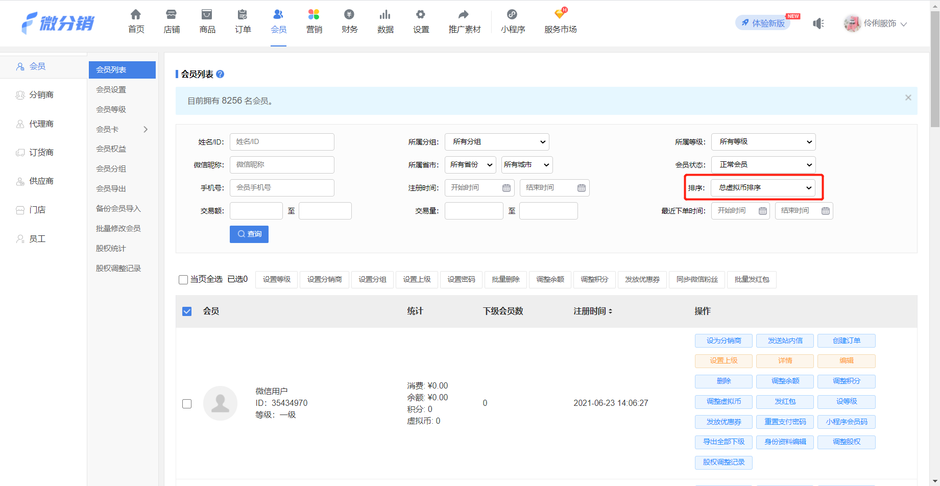 用戶場景:會員列表排序增加虛擬幣排行,方便商家查詢會員虛擬幣信息;