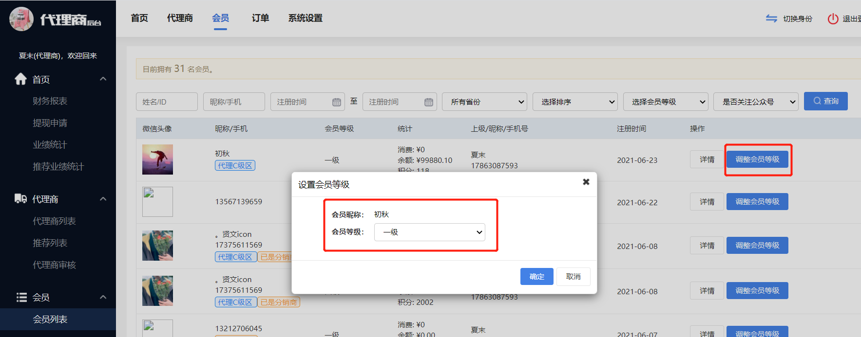 現(xiàn)邏輯:新增對會員等級的調(diào)整功能,新增對會員分銷商資質(zhì)的管理;