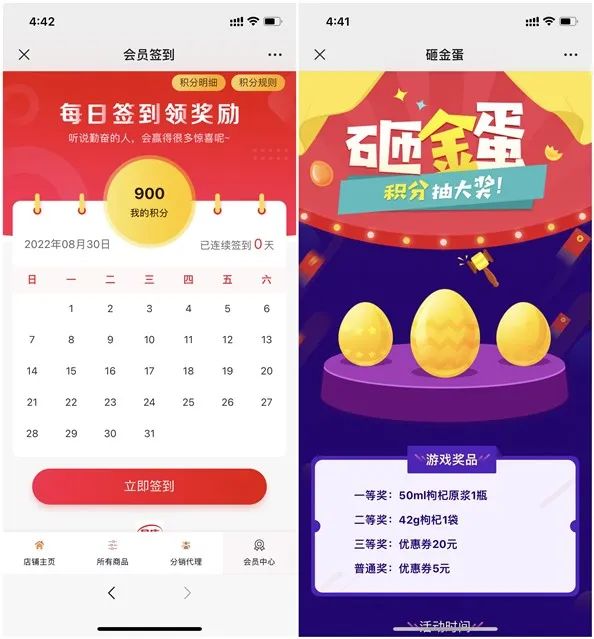 ① 參與游戲:200積分一次砸金蛋游戲,一等獎獲得500ml枸杞原漿一瓶,二等獎獲得42g枸杞1袋,三等獎獲得20元優惠券,四等獎獲得5元優惠券;