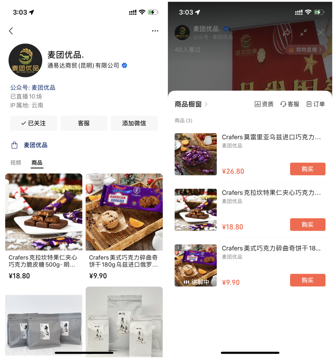 麥團優品用視頻號開啟品牌自播,從直播到銷售的整個環節,都是在自己的私域流量池完成,減少不必要的用戶流失,小程序商城內的商品,可以直接上架到視頻號直播間,開啟帶貨,從而提高私域的成交轉化。