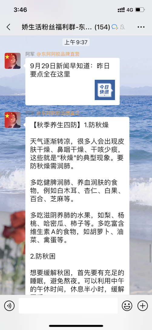 東阿阿膠的社群運營主要靠“阿軍”引導和承接話題,用戶自發進行群內互動,群內隨手翻幾頁就有交流互動。