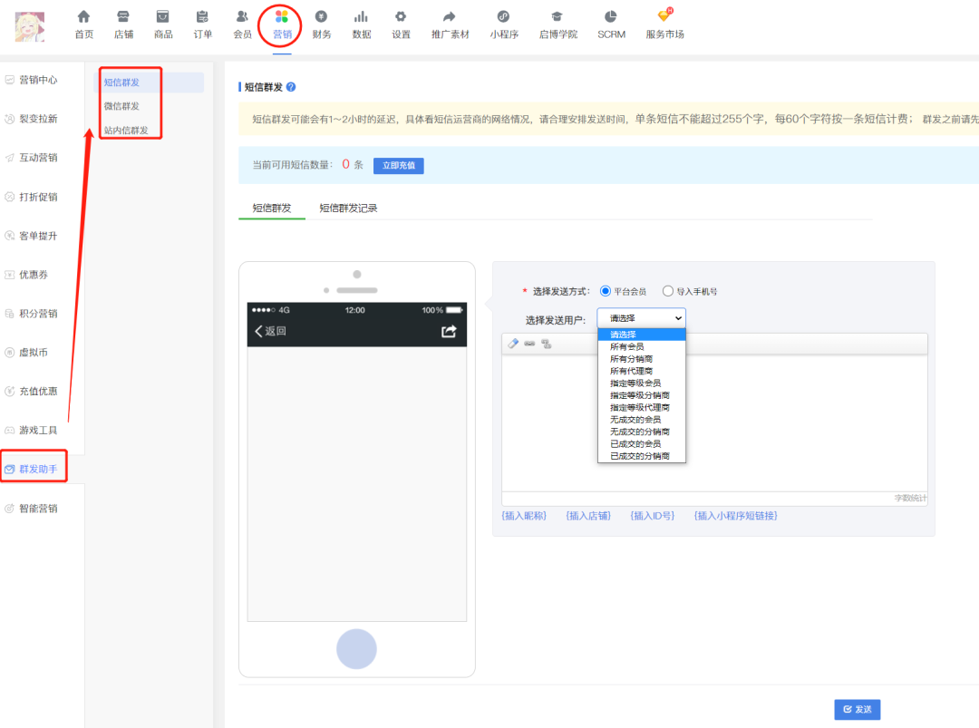 ① 短信群發:以短信的形式發給商城內的會員、分銷商、代理商、訂貨商等用戶,也可以導入手機號到平臺內,將短信發送給這批自定義用戶;