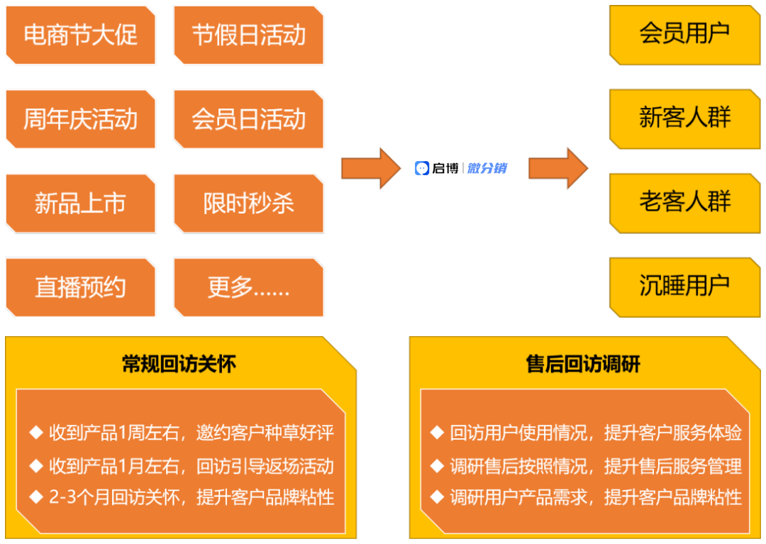 在用戶購買產品后,做邀約用戶種草好評、引導返場活動、回訪使用情況、調研產品需求等環節,提升用戶服務體驗和品牌粘性。
