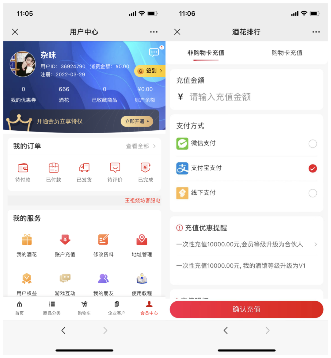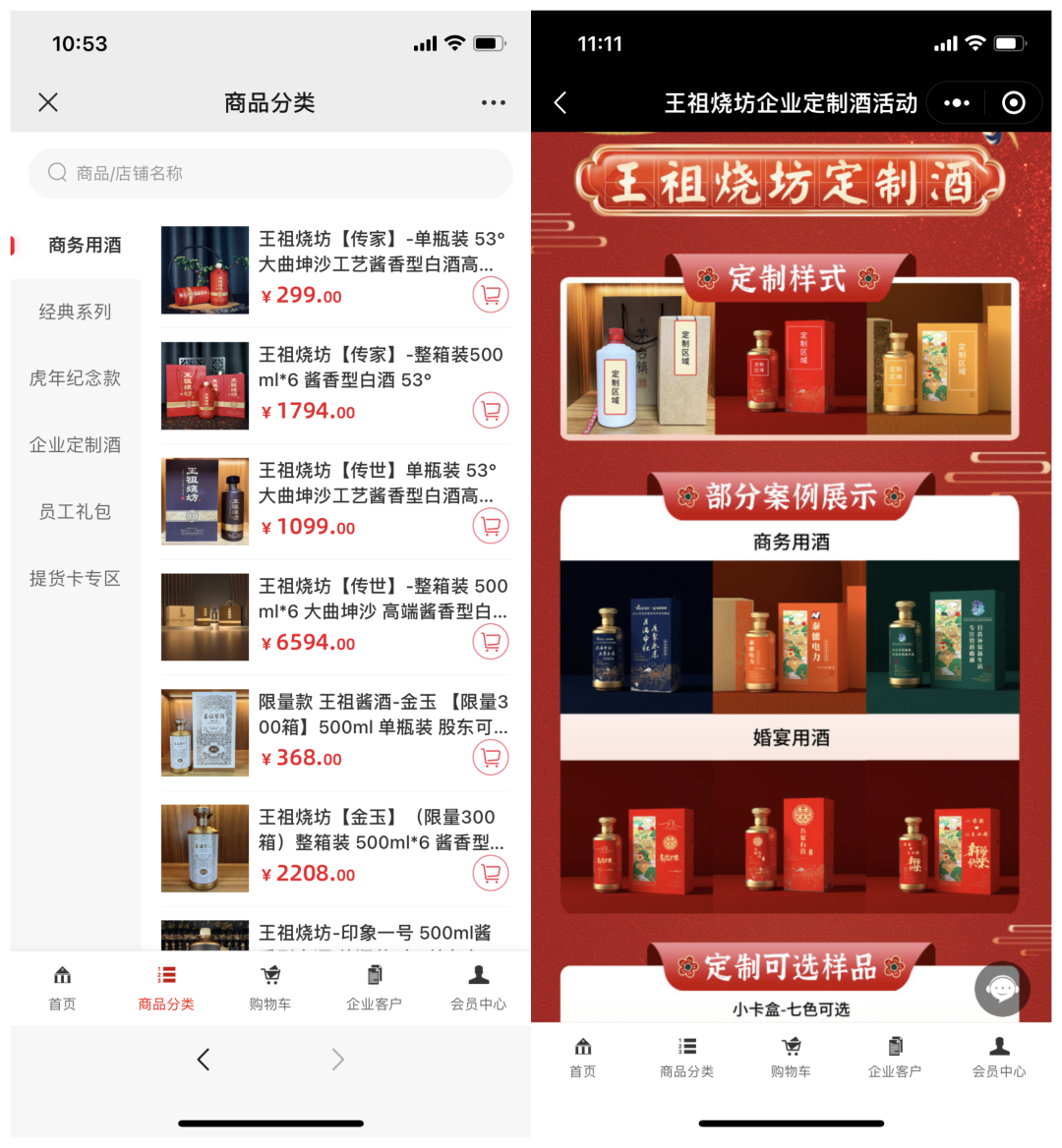 王祖燒坊合作啟博微分銷,同時(shí)部署了小程序商城和h5微商城,商品、會(huì)員、訂單等數(shù)據(jù)互通,商城分布統(tǒng)一都是“首頁”、“商品分類”、“購物車”、“企業(yè)客戶”、“會(huì)員中心”五大模塊構(gòu)成。