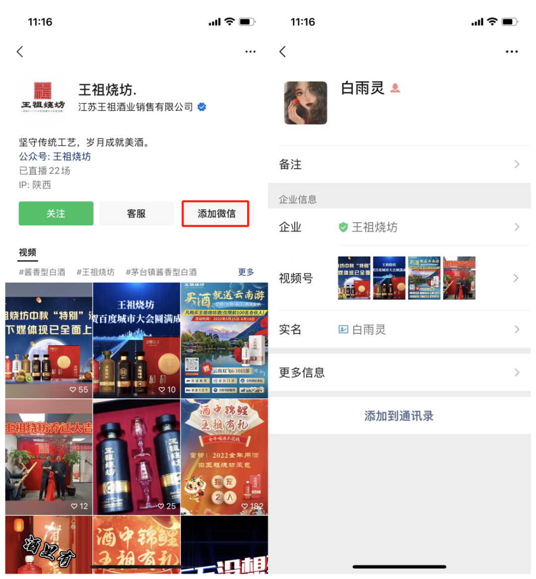 結(jié)合線上小程序商城,「王祖燒坊」也進(jìn)一步將公眾號(hào)、視頻號(hào)實(shí)現(xiàn)了觸達(dá)、溝通、轉(zhuǎn)化的一體化全鏈路經(jīng)營閉環(huán)。也將品牌資源優(yōu)勢(shì)充分放大,助力用戶深度沉淀,為用戶提供更加近距離的交互。在視頻號(hào)「王祖燒坊」的主頁內(nèi)設(shè)置福利官「白雨靈」的企微,引導(dǎo)進(jìn)入小程序商城。