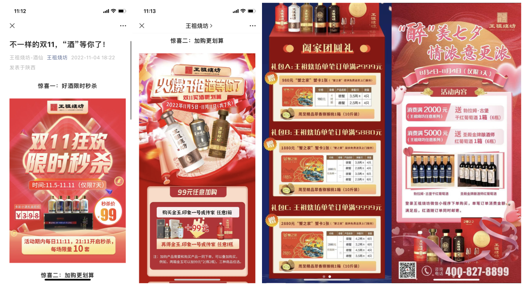 王祖燒坊適逢傳統(tǒng)節(jié)日、大促營銷節(jié),商城內(nèi)會(huì)上線特惠福利給到消費(fèi)者,如“滿贈(zèng)”、“秒殺”等營銷活動(dòng)。