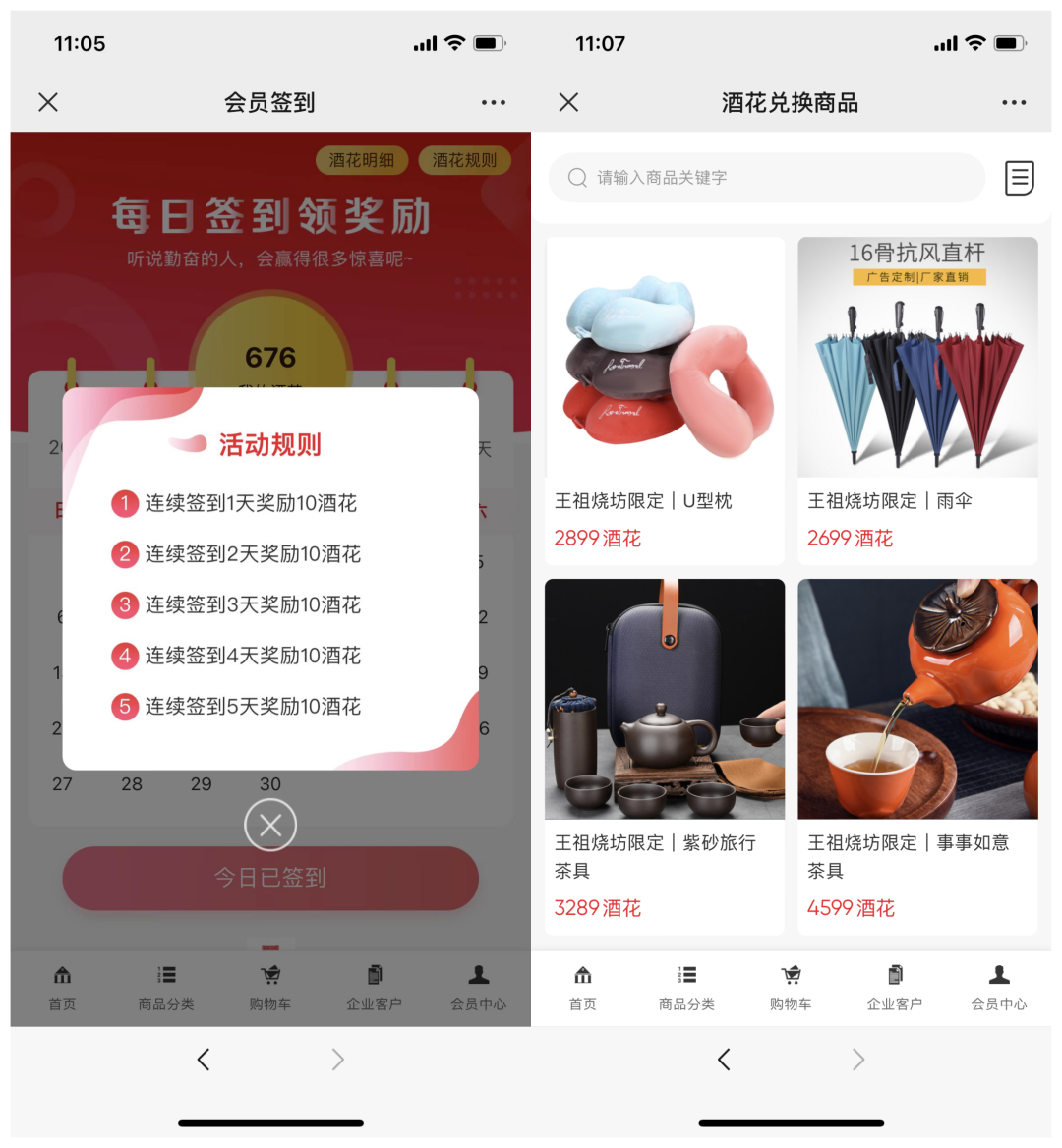在白酒商品之外,王祖燒坊把低客單、復(fù)購高的生活用品:如U型枕、雨傘等引入到線上商城,再通過上線簽到打卡、蘿卜精靈游戲、下單贈(zèng)酒花(積分)等營銷玩法,提升客戶的進(jìn)店頻次,同時(shí)酒花(積分)還能兌換該類商品。