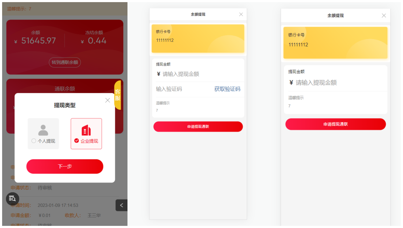 2.沒有開啟開關時,獲取驗證碼之后不用審核直接發放,開啟開關后,沒有了獲取驗證碼,發起提現請求后需要到商城后臺審核