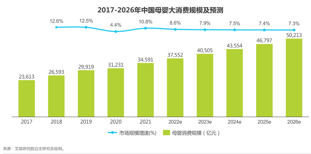 自2017年起中國母嬰消費(fèi)規(guī)模持續(xù)上升且增速保持在10%以上,受疫情影響2020年消費(fèi)規(guī)模增速下滑至4.4%,但隨著防疫工作的積極推進(jìn),2021年起中國母嬰大消費(fèi)市場(chǎng)規(guī)模逐漸回暖。此外雖然受制于中國新生人口持續(xù)減少,中國母嬰大消費(fèi)規(guī)模未來將可預(yù)見性的呈現(xiàn)較低的增速,但隨著人均收入不斷提升,母嬰消費(fèi)者購買能力提升,以及得益于精細(xì)化養(yǎng)娃觀念母嬰產(chǎn)品消費(fèi)需求不斷升級(jí),都將持續(xù)推動(dòng)母嬰大消費(fèi)行業(yè)規(guī)模的增長,實(shí)現(xiàn)行業(yè)穩(wěn)定發(fā)展。