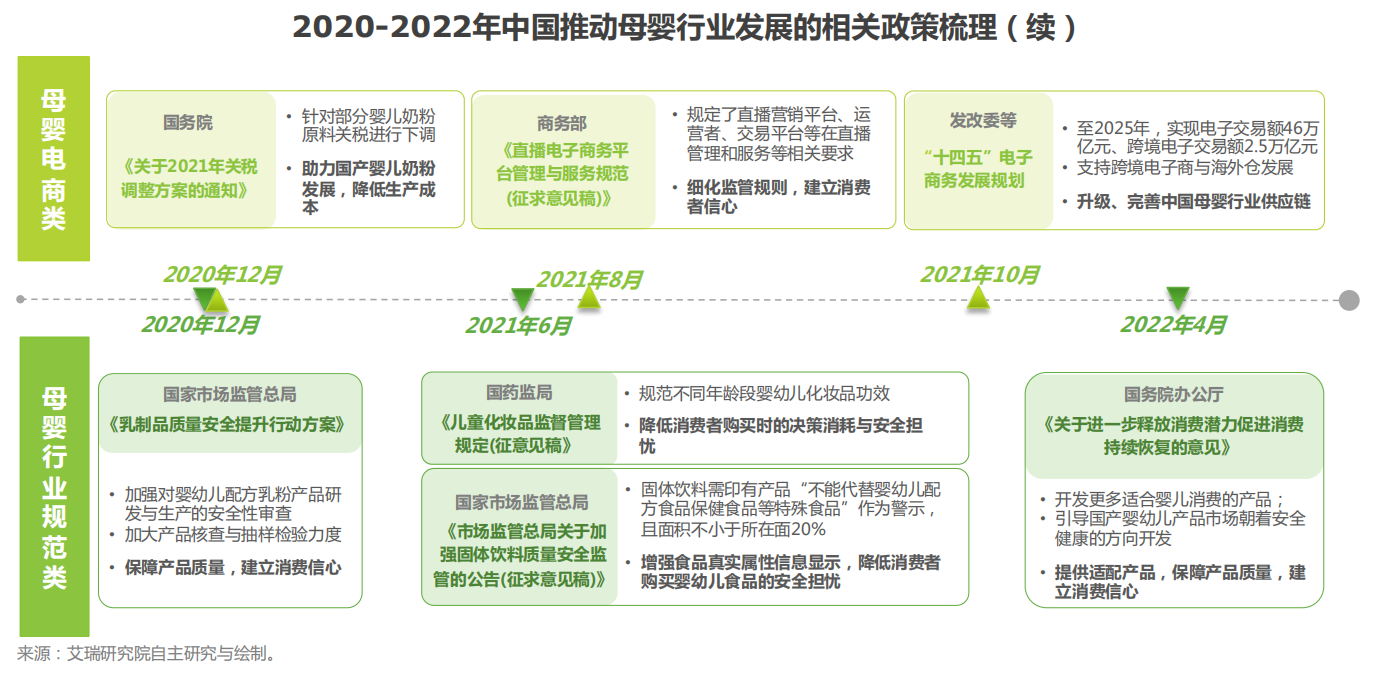 政策多向推動(dòng)母嬰行業(yè)發(fā)展。就母嬰消費(fèi)線上部分,政策鼓勵(lì)母嬰企業(yè)積極參與電商交易,就行業(yè)規(guī)范方面,政策就各主要母嬰大消費(fèi)產(chǎn)品品類提出更嚴(yán)格的產(chǎn)品安全要求,并積極推動(dòng)適配母嬰消費(fèi)產(chǎn)品研發(fā)與生產(chǎn),增加消費(fèi)者產(chǎn)品選擇的同時(shí),降低消費(fèi)者由于產(chǎn)品安全等憂慮產(chǎn)生的購買決策消耗,提高消費(fèi)信心。
