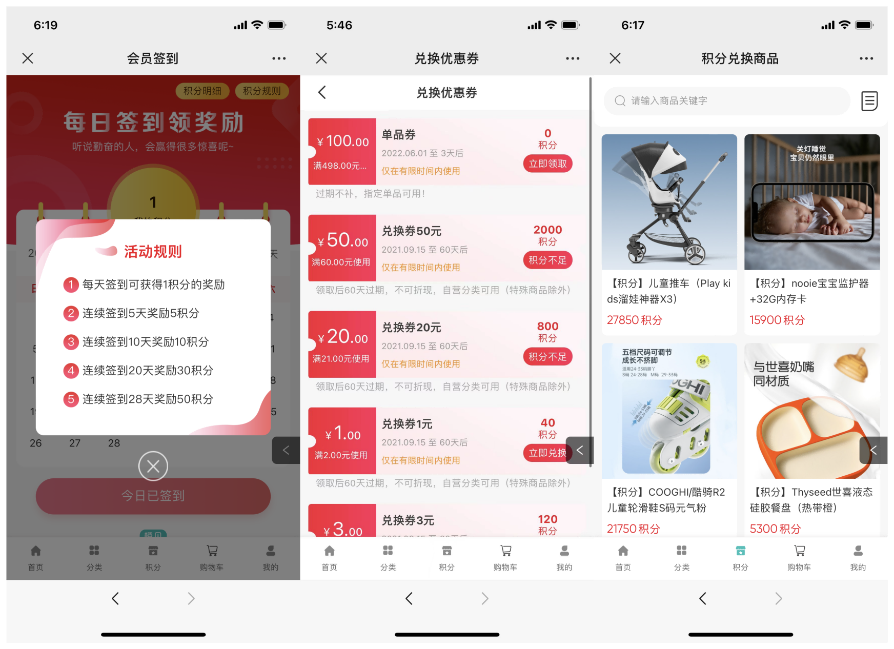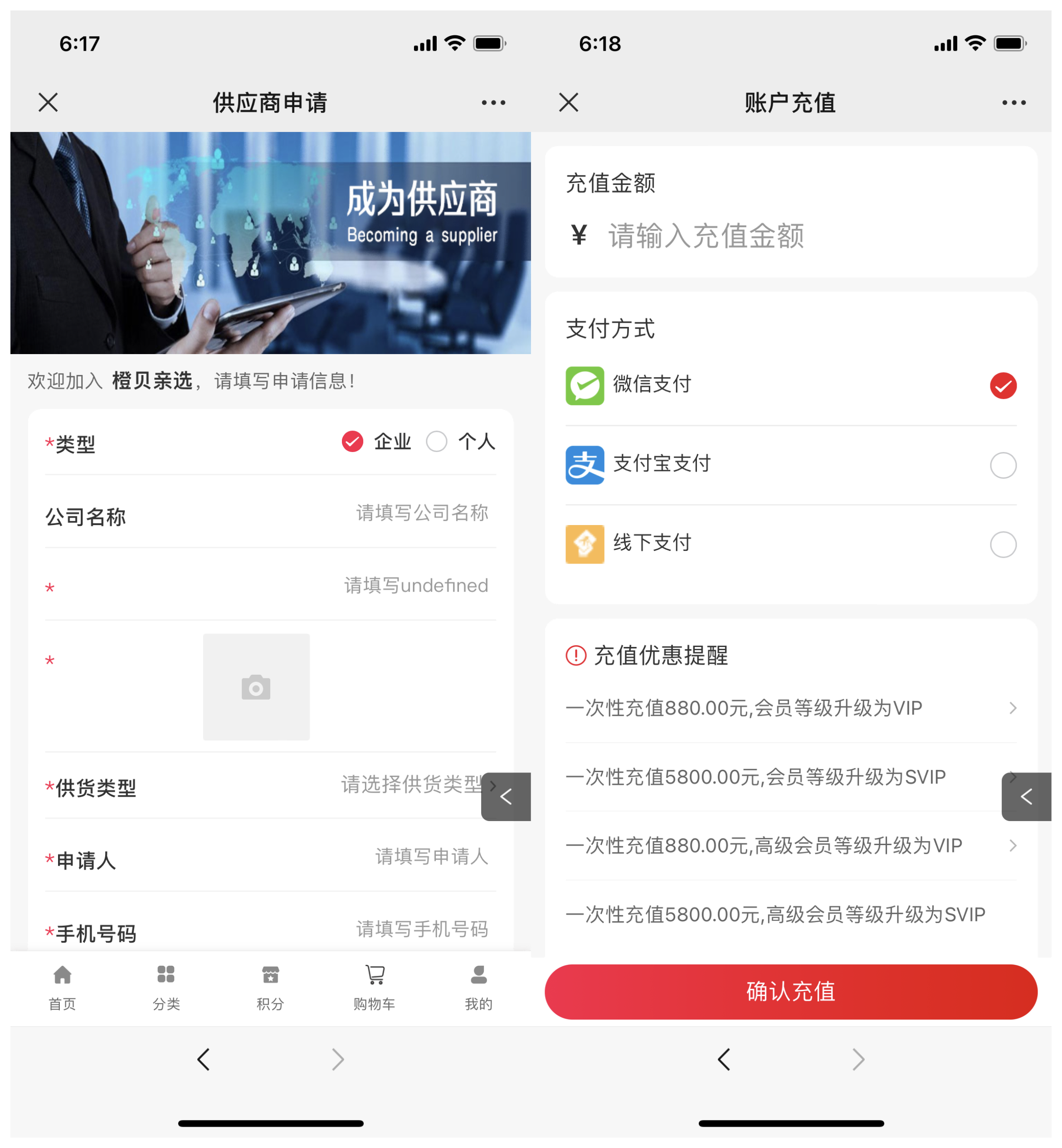 橙貝親選合作啟博微分銷系統(tǒng),搭建了微商城和小程序商城,一店雙核商城分布由“首頁”、“分類”、“積分”、“購物車”、“我的”五大模塊構(gòu)成。