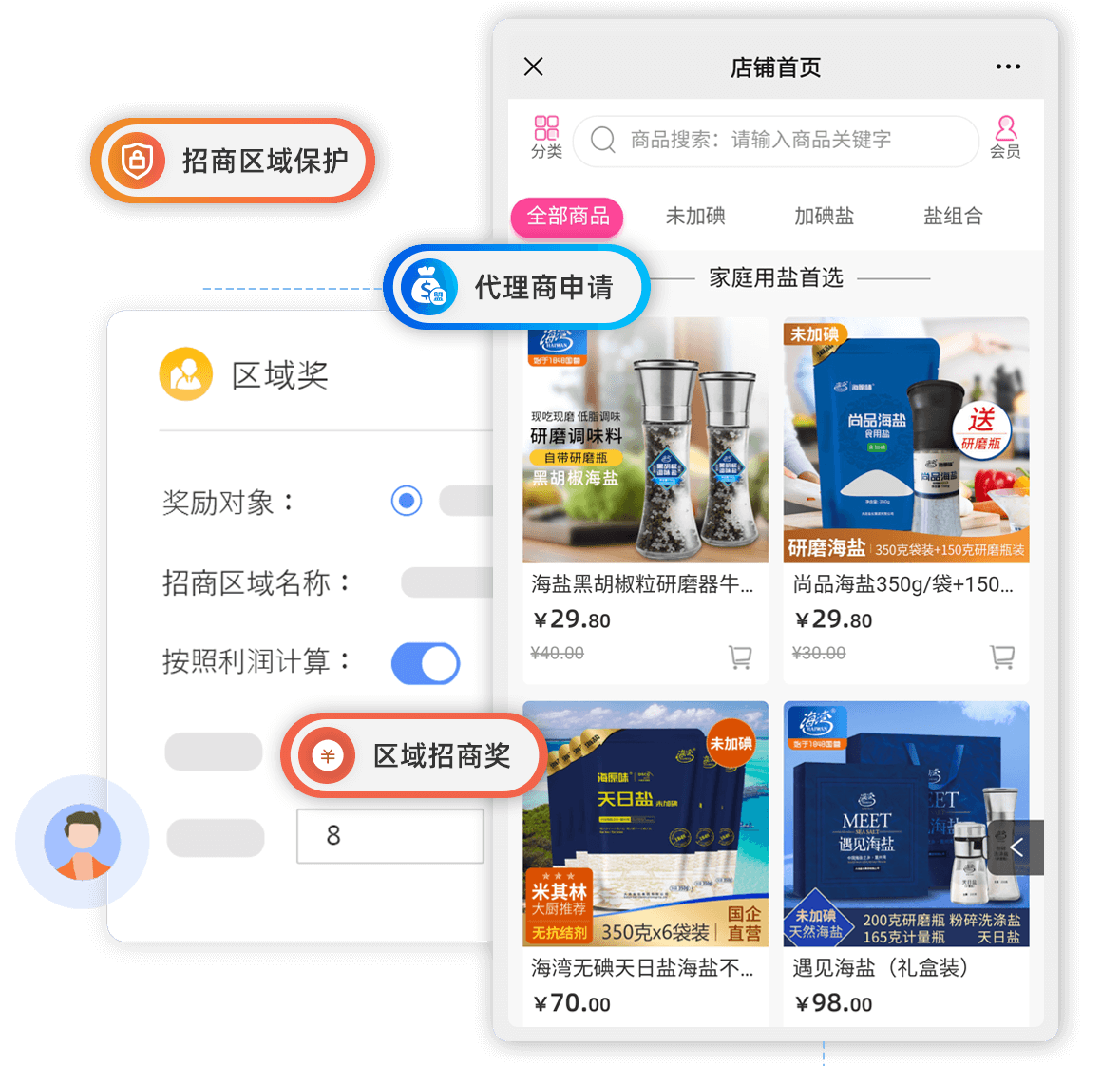 線上代理加盟模式,支持區域、非區域劃分,裂變式招商獲客更簡單 -