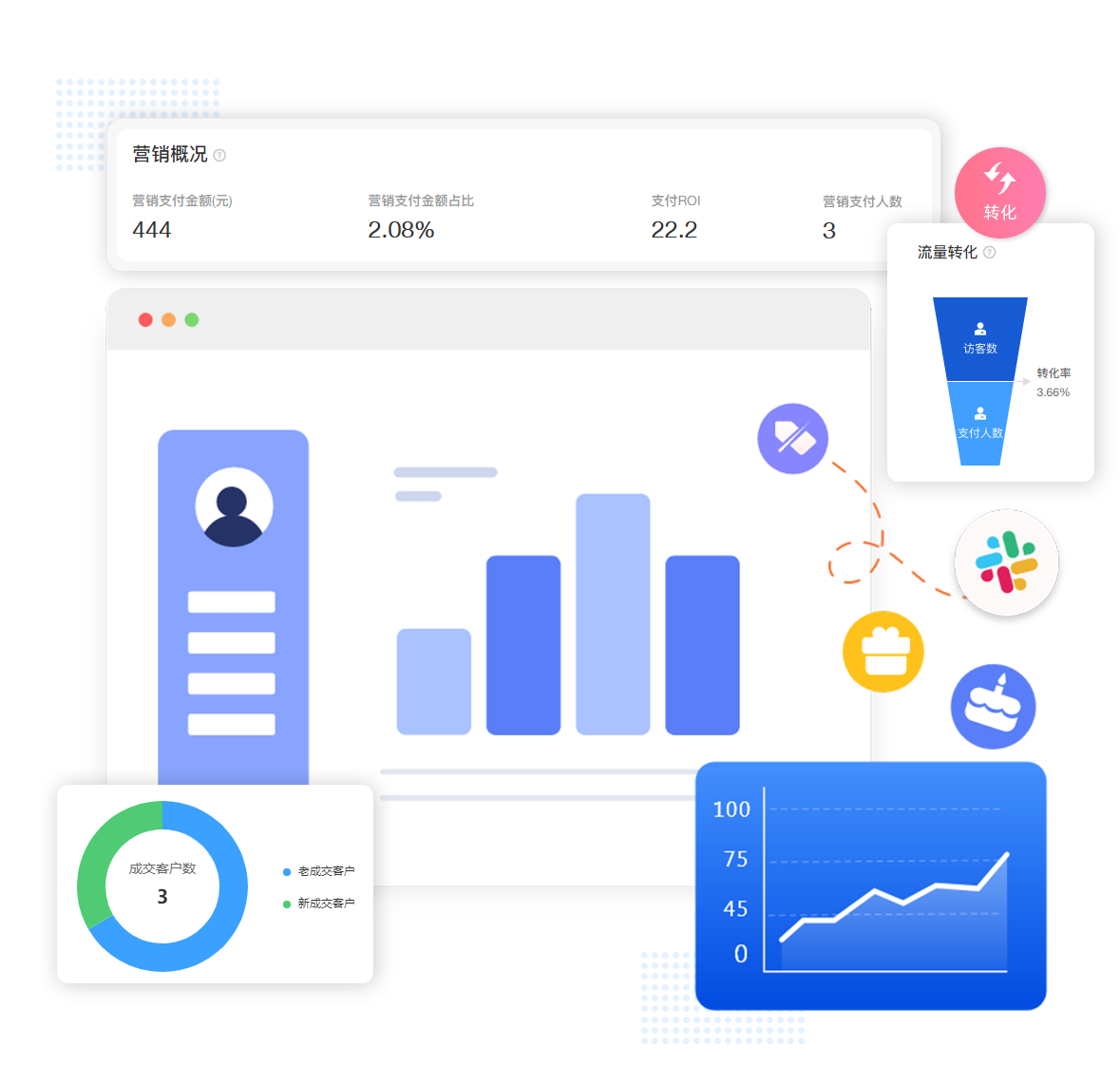 交易數據從下單人數、金額、次數、地域等全方位分析店鋪經營情況,用數據促