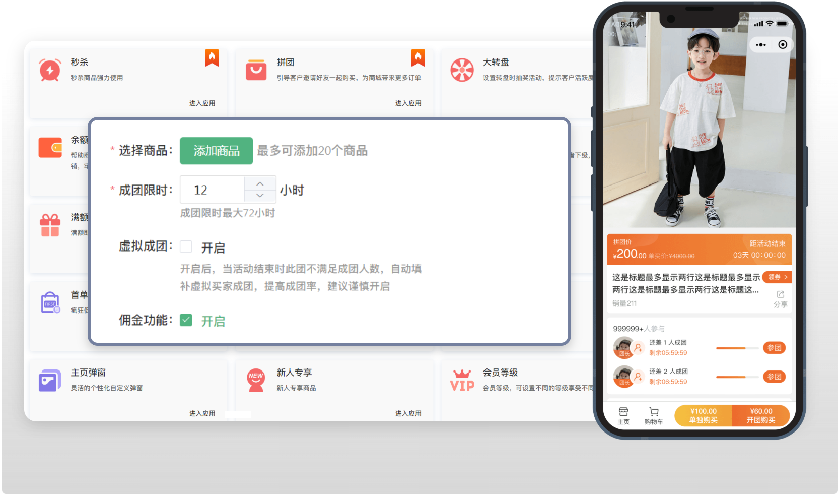砍價、拼團、秒殺、優惠券、會員營銷、二級分銷、積分兌換等海量營銷工具,覆蓋拉新、轉化、促活、復購、裂變全環節,滿足企業全場景營銷訴求。