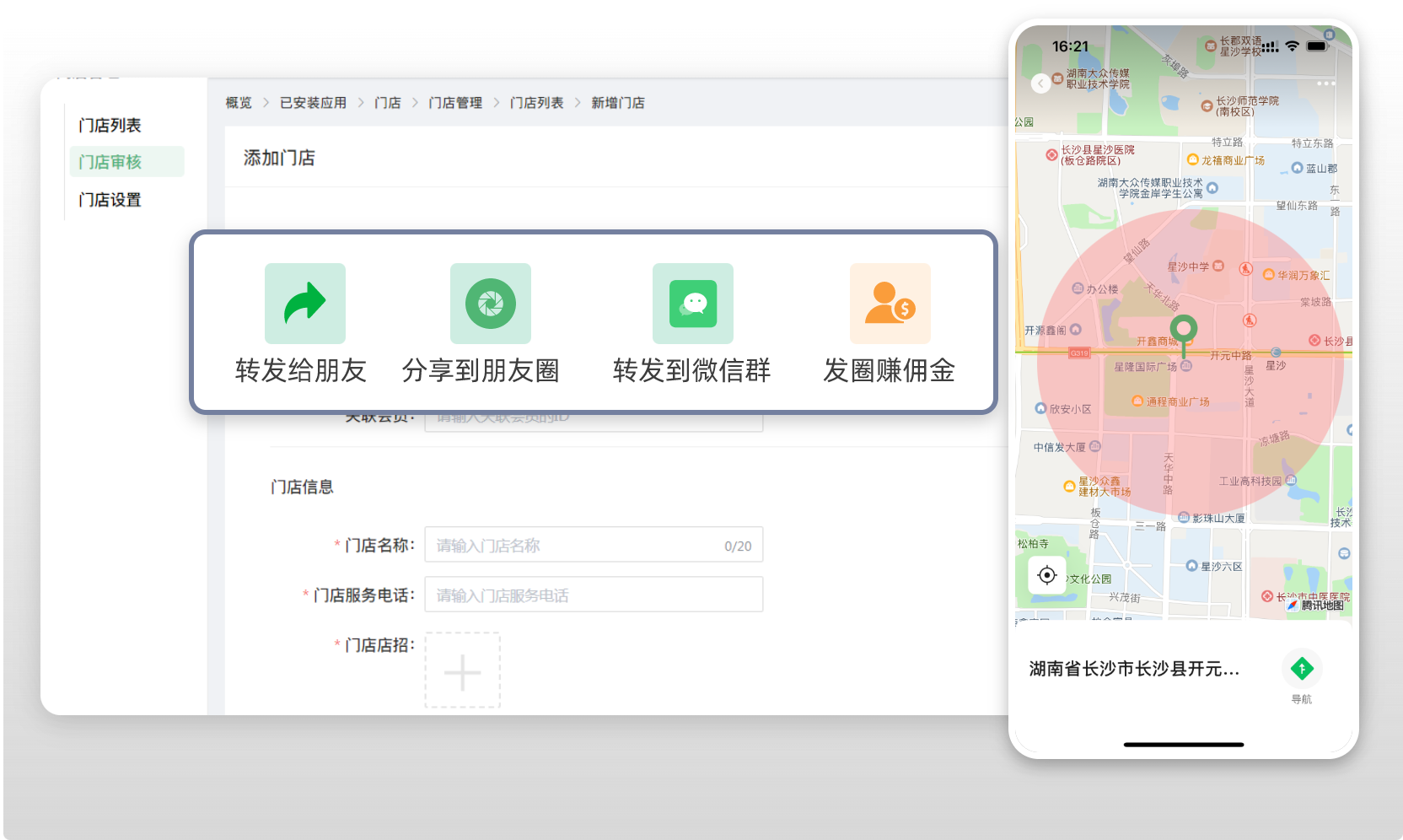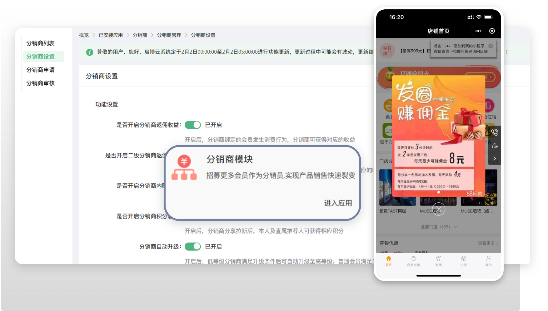 通過一體化的分銷系統(tǒng)和傭金體系,激勵店員/會員通過社交平臺分享商品鏈接、海報等,吸引更多的流量進入商家的線上或線下店鋪,同時店員/會員也可以獲得相應的傭金促進銷售,低成本獲客。