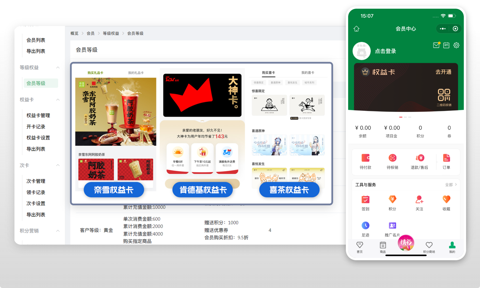 高效的會員管理體系,可匹配不同等級會員需求,不同等級享受不同權益;同時可支持會員權益卡、次卡售賣服務,結合積分營銷體系,輕松促進用戶的粘性與轉化、復購。